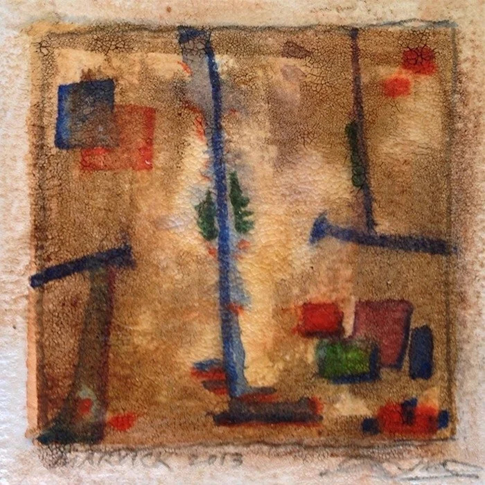 These very small paintings in watercolor with acrylic and oil elements are among a growing number of near-miniatures that result from an effort to create a travel-size painting kit small enough to fit easily in a shirt pocket, yet comprehensive enough to allow for the creation of the relatively complex textures which have become a part of my visual-expressive world. The paintings shown here date from September 2013, and are about 2.5 x 2.5 inches square.